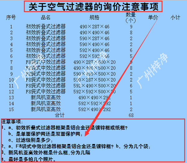 如果您是中間商或公司新來的采購,更要詳細(xì)了解下面有關(guān)于空氣過濾器詢價(jià)注意事項(xiàng),下面是一個(gè)代理商發(fā)過來的詢價(jià)單,梓凈特意整理供參考,希望能幫到大家!