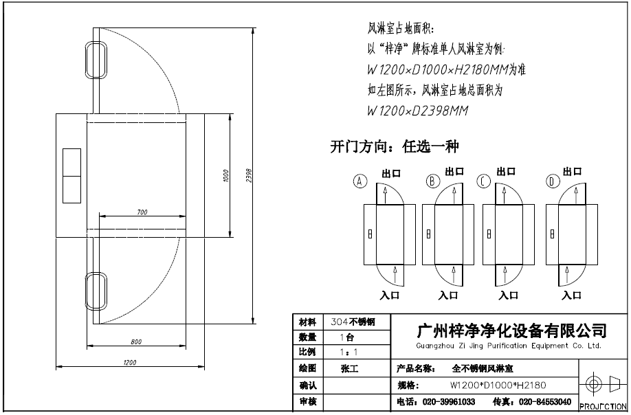 上圖為風(fēng)淋室的占地面積,我們以“梓凈”牌單人雙吹風(fēng)淋室為例,W1200*D1000*H2180MM,如上圖所示,風(fēng)淋室的占地面積為W1200*H2398MM,這樣我們在凈化廠房設(shè)計(jì)時(shí)就可以把風(fēng)淋室的占地面積留出來,供風(fēng)淋室安裝,當(dāng)然,也有特殊情況,要做異形風(fēng)淋室,那么就來電咨詢我們吧~~~
