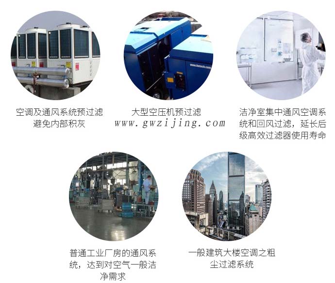 空調(diào)及通風系統(tǒng)預(yù)過濾避免內(nèi)部積灰、大型空壓機預(yù)過濾、潔凈室集中通風空調(diào)系統(tǒng)和回風過濾、延長后級高效過濾器使用壽命、普通工業(yè)廠房的通風系統(tǒng)、一般建筑大樓空調(diào)之粗塵過濾系統(tǒng)、達到對空氣一般潔凈需求。