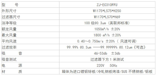 FFU風(fēng)機(jī)過濾機(jī)組規(guī)格尺寸及其它參數(shù):