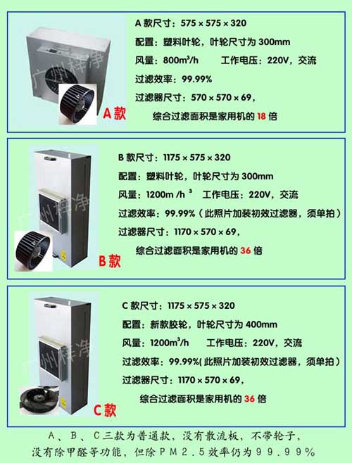 家用FFU獨特風(fēng)道(阿基米德螺旋線風(fēng)道)設(shè)計。A款B款C款家用FFU凈化器性能對比