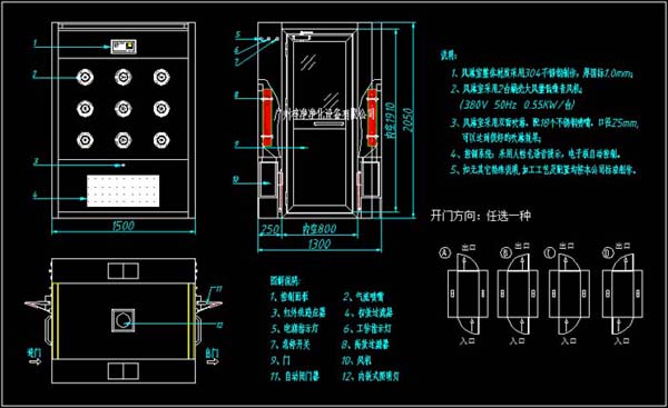 凈化車間風(fēng)淋室設(shè)計(jì)制作材料說明:A、全冷軋鋼板烤漆;B、外箱體冷軋鋼板烤漆內(nèi)膽砂光不銹鋼;C、全不銹鋼;(注:根據(jù)不同使用環(huán)境不銹鋼可選201或304)。
