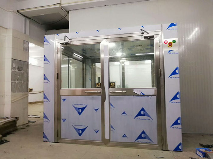 3、手動雙開門貨物風淋室閉門器選擇90度定位,手動雙開門人淋風淋室閉門器選擇不定位的。貨物風淋室現(xiàn)場安裝圖貨物風淋室制作及功能: