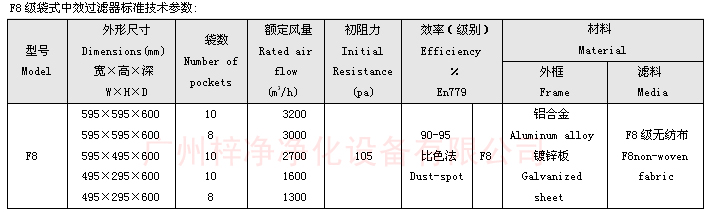 F8級(jí)袋式中效過(guò)濾器標(biāo)準(zhǔn)尺寸技術(shù)參數(shù)