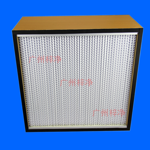 木框有隔板高效過濾器濾材兩面180褶翻折形成鍥形褶層,濾料折彎時有兩道壓痕,使其在隔板的尾端開成鍥形盒式褶層,鍥形盒式褶層可以防止濾料破損。在腐蝕性環(huán)境中,可使用鍍乙烯隔板,捕捉0.3umr粒子效率99.99%。