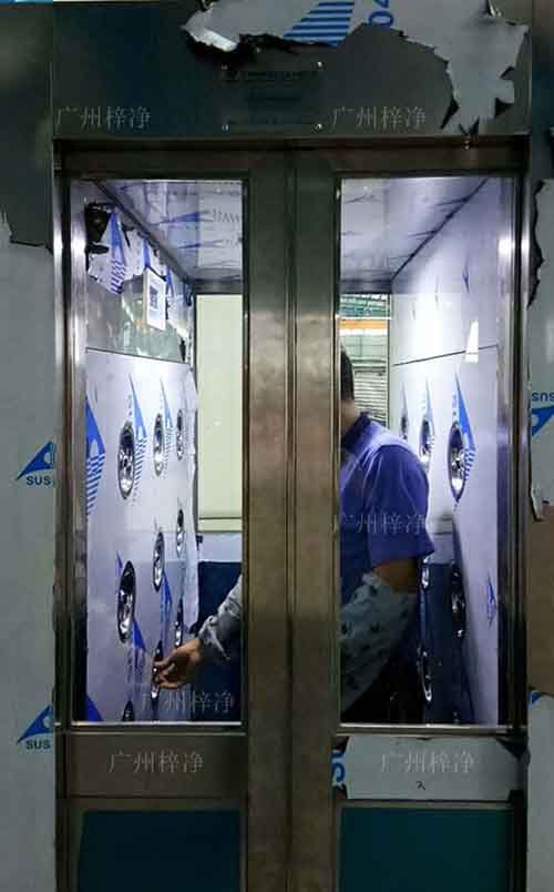 2、頂吹風淋室的底板由鋼板折彎焊接而成,并附烤漆處理加強筋,表面附不銹鋼制作而成。箱體采用優(yōu)質(zhì)的冷軋鋼板制造,表面靜電噴塑或烤漆處理,美觀大方,內(nèi)底板全不銹鋼板制做耐摩擦,易清潔。箱體主材及外形尺寸可根據(jù)客戶要求定制。三吹風淋室安裝現(xiàn)場